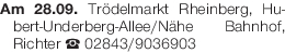 Am 28.09. Trödelmarkt Rheinberg, Hubert-Underberg-Allee/Nähe Bahnhof, Richter Tel.02843/9036903Das könnte Sie auch interessieren