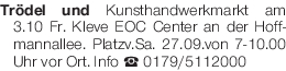 Trödel und Kunsthandwerkmarkt am 3.10 Fr. Kleve EOC Center an der Hoffmannallee. Platzv.Sa. 27.09.von 7-10.00 Uhr vor Ort. Info Tel. 0179/5112000Das könnte Sie auch interessieren