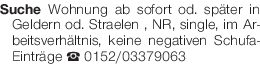 Suche Wohnung ab sofort od. später in Geldern od. Straelen , NR, single, im Arbeitsverhältnis, keine negativen Schufa-Einträge Tel. 0152/03379063Das könnte Sie auch interessieren
