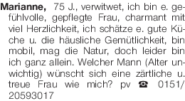 Marianne, 75 J., verwitwet, ich bin e. gefühlvolle, gepflegte Frau, charmant mit viel Herzlichkeit, ich schätze e. gute Küche u. die häusliche Gemütlichkeit, bin mobil, mag die Natur, doch leider bin ich ganz allein. Welcher Mann (Alter unwichtig) wünscht sich eine zärtliche u. treue Frau wie mich? pv Tel. 0151/20593017Das könnte Sie auch interessieren