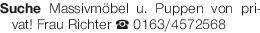 Suche Massivmöbel u. Puppen von privat! Frau Richter Tel. 0163/4572568Das könnte Sie auch interessieren