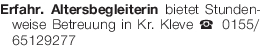Erfahr. Altersbegleiterin bietet Stundenweise Betreuung in Kr. Kleve Tel. 0155/65129277Das könnte Sie auch interessieren
