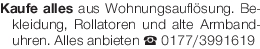 Kaufe alles aus Wohnungsauflösung. Bekleidung, Rollatoren und alte Armbanduhren. Alles anbieten Tel. 0177/3991619Das könnte Sie auch interessieren