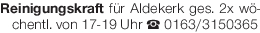 Reinigungskraft für Aldekerk ges. 2x wöchentl. von 17-19 Uhr Tel.0163/3150365Das könnte Sie auch interessieren