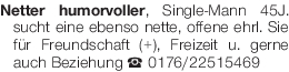 Netter humorvoller, Single-Mann 45J. sucht eine ebenso nette, offene ehrl. Sie für Freundschaft (+), Freizeit u. gerne auch Beziehung Tel. 0176/22515469Das könnte Sie auch interessieren