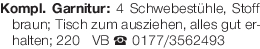 Kompl. Garnitur: 4 Schwebestühle, Stoff braun; Tisch zum ausziehen, alles gut erhalten; 220€ VB Tel. 0177/3562493Das könnte Sie auch interessieren