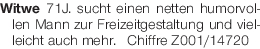 Witwe 71J. sucht einen netten humorvollen Mann zur Freizeitgestaltung und vielleicht auch mehr. Chiffre Chiffre Z001/14720Das könnte Sie auch interessieren