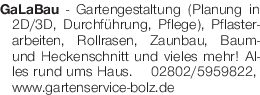 GaLaBau - Gartengestaltung (Planung in 2D/3D, Durchführung, Pflege), Pflasterarbeiten, Rollrasen, Zaunbau, Baum- und Heckenschnitt und vieles mehr! Alles rund ums Haus. Tel. 02802/5959822, www.gartenservice-bolz.deDas könnte Sie auch interessieren