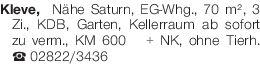 Kleve, Nähe Saturn, EG-Whg., 70 m², 3 Zi., KDB, Garten, Kellerraum ab sofort zu verm., KM 600 € + NK, ohne Tierh. Tel. 02822/3436Das könnte Sie auch interessieren