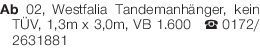 Ab 02, Westfalia Tandemanhänger, kein TÜV, 1,3m x 3,0m, VB 1.600€ Tel.0172/2631881Das könnte Sie auch interessieren
