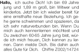 Hallo, ich suche Dich! Ich bin 69 Jahre jung und 1,89 m groß, bin Witwer und kinderlos. Jetzt bin ich wieder bereit für eine ernsthafte neue Beziehung. Ich gehe gerne schwimmen und spazieren, da ich sehr naturverbunden bin. Wenn Du mich auch kennenlernen möchtest und Du zwischen 60-65 Jahre jung bist, würde ich mich freuen, Dich kennen zu lernen. Dann melde Dich. Bis dahin auch alles Gute für Dich. Chiffre Chiffre Z002/14724Das könnte Sie auch interessieren