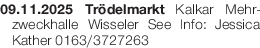 09.11.2025 Trödelmarkt Kalkar Mehrzweckhalle Wisseler See Info: Jessica Kather 0163/3727263Das könnte Sie auch interessieren