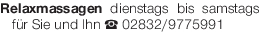 Relaxmassagen dienstags bis samstags für Sie und Ihn Tel. 02832/9775991Das könnte Sie auch interessieren