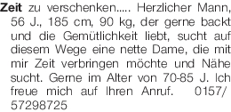 Zeit zu verschenken..... Herzlicher Mann, 56 J., 185 cm, 90 kg, der gerne backt und die Gemütlichkeit liebt, sucht auf diesem Wege eine nette Dame, die mit mir Zeit verbringen möchte und Nähe sucht. Gerne im Alter von 70-85 J. Ich freue mich auf Ihren Anruf. Tel. 0157/57298725Das könnte Sie auch interessieren
