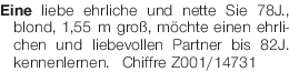 Eine liebe ehrliche und nette Sie 78J., blond, 1,55 m groß, möchte einen ehrlichen und liebevollen Partner bis 82J. kennenlernen. Chiffre Chiffre Z001/14731Das könnte Sie auch interessieren