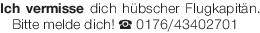 Ich vermisse dich hübscher Flugkapitän. Bitte melde dich! Tel. 0176/43402701Das könnte Sie auch interessieren