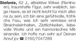 Stefanie, 62 J., attraktive Witwe (Rentnerin), traumhafte Figur, sehr weiblich, lange Haare, es ist nicht leicht für mich alleine zu sein, ich bin eine gefühlvolle, fröhliche Frau, was ich sehr vermisse sind Streicheleinheiten, Zärtlichkeiten, liebevolle Worte und ein harmonisches Miteinander. Ich hoffe nun sehr auf Deinen Anruf pv Tel. 0160/7047289Das könnte Sie auch interessieren