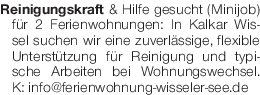 Reinigungskraft & Hilfe gesucht (Minijob) für 2 Ferienwohnungen: In Kalkar Wissel suchen wir eine zuverlässige, flexible Unterstützung für Reinigung und typische Arbeiten bei Wohnungswechsel. K: info@ferienwohnung-wisseler-see.deDas könnte Sie auch interessieren