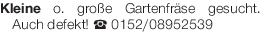 Kleine o. große Gartenfräse gesucht. Auch defekt! Tel. 0152/08952539Das könnte Sie auch interessieren
