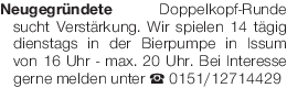 Neugegründete Doppelkopf-Runde sucht Verstärkung. Wir spielen 14 tägig dienstags in der Bierpumpe in Issum von 16 Uhr - max. 20 Uhr. Bei Interesse gerne melden unter Tel. 0151/12714429Kontakt