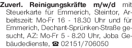 Zuverl. Reinigungskräfte m/w/d mit Steuerkarte für Emmerich, Steintor, Arbeitszeit: Mo-Fr 16 - 18.30 Uhr und für Emmerich, Dechant-Sprünken-Straße gesucht, AZ: Mo-Fr 5 - 8.20 Uhr, Joba Gebäudedienste, Tel. 02151/706050Das könnte Sie auch interessieren