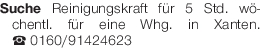 Suche Reinigungskraft für 5 Std. wöchentl. für eine Whg. in Xanten. Tel. 0160/91424623Das könnte Sie auch interessieren