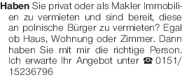 Haben Sie privat oder als Makler Immobilien zu vermieten und sind bereit, diese an polnische Bürger zu vermieten? Egal ob Haus, Wohnung oder Zimmer. Dann haben Sie mit mir die richtige Person. Ich erwarte Ihr Angebot unter Tel. 0151/15236796Das könnte Sie auch interessieren