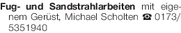 Fug- und Sandstrahlarbeiten mit eigenem Gerüst, Michael Scholten Tel.0173/5351940Das könnte Sie auch interessieren