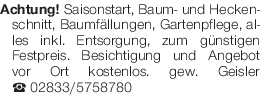 Achtung! Saisonstart, Baum- und Heckenschnitt, Baumfällungen, Gartenpflege, alles inkl. Entsorgung, zum günstigen Festpreis. Besichtigung und Angebot vor Ort kostenlos. gew. Geisler Tel. 02833/5758780Das könnte Sie auch interessieren