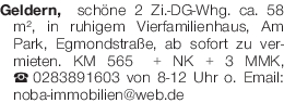 Geldern, schöne 2 Zi.-DG-Whg. ca. 58 m², in ruhigem Vierfamilienhaus, Am Park, Egmondstraße, ab sofort zu vermieten. KM 565€ + NK + 3 MMK, Tel.0283891603 von 8-12 Uhr o. Email: noba-immobilien@web.deDas könnte Sie auch interessieren