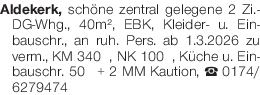 Aldekerk, schöne zentral gelegene 2 Zi.-DG-Whg., 40m², EBK, Kleider- u. Einbauschr., an ruh. Pers. ab 1.3.2026 zu verm., KM 340€, NK 100€, Küche u. Einbauschr. 50€ + 2 MM Kaution, Tel.0174/6279474Das könnte Sie auch interessieren