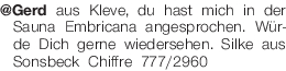 @Gerd aus Kleve, du hast mich in der Sauna Embricana angesprochen. Würde Dich gerne wiedersehen. Silke aus Sonsbeck Chiffre Chiffre 777/2960Das könnte Sie auch interessieren