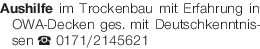 Aushilfe im Trockenbau mit Erfahrung in OWA-Decken ges. mit Deutschkenntnissen Tel.0171/2145621Das könnte Sie auch interessieren