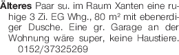 Älteres Paar su. im Raum Xanten eine ruhige 3 Zi. EG Whg., 80 m² mit ebenerdiger Dusche. Eine gr. Garage an der Wohnung wäre super, keine Haustiere. Tel. 0152/37325269Das könnte Sie auch interessieren