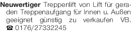 Neuwertiger Treppenlift von Lift für geraden Treppenaufgang für Innen u. Außen geeignet günstig zu verkaufen VB. Tel. 0176/27332245Das könnte Sie auch interessieren