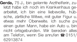 Gerda, 75 J., bin gelernte Arzthelferin, zuletzt habe ich noch im Krankenhaus gearbeitet, ich bin eine liebevolle, hübsche, zärtliche Witwe, mit guter Figur u. etwas mehr Oberweite. Ich suche pv einen guten Mann, habe ein Auto u. bin nicht ortsgebunden. Wir bereden alles am Telefon, wenn Sie anrufen Tel. 0151/62913874Das könnte Sie auch interessieren