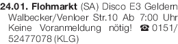 24.01. Flohmarkt (SA) Disco E3 Geldern Walbecker/Venloer Str.10 Ab 7:00 Uhr Keine Voranmeldung nötig! Tel. 0151/52477078 (KLG)