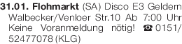 31.01. Flohmarkt (SA) Disco E3 Geldern Walbecker/Venloer Str.10 Ab 7:00 Uhr Keine Voranmeldung nötig! Tel. 0151/52477078 (KLG)
