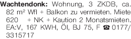 Wachtendonk: Wohnung, 3 ZKDB, ca. 82 m² Wfl + Balkon zu vermieten. Miete 620 € + NK + Kaution 2 Monatsmieten. EA:V, 167 KWH, Öl, BJ 75, F Tel. 0177/3315717