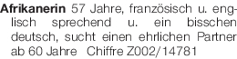 Afrikanerin 57 Jahre, französisch u. englisch sprechend u. ein bisschen deutsch, sucht einen ehrlichen Partner ab 60 Jahre Chiffre Chiffre Z002/14781