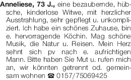 Anneliese, 73 J., eine bezaubernde, hübsche, kinderlose Witwe, mit herzlicher Ausstrahlung, sehr gepflegt u. unkompliziert. Ich habe ein schönes Zuhause, bin e. hervorragende Köchin. Mag schöne Musik, die Natur u. Reisen. Mein Herz sehnt sich pv nach e. aufrichtigen Mann. Bitte haben Sie Mut u. rufen mich an, wir könnten getrennt od. gemeinsam wohnen Tel. 0157/75069425
