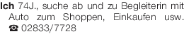 Ich 74J., suche ab und zu Begleiterin mit Auto zum Shoppen, Einkaufen usw. Tel. 02833/7728
