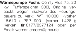 Wärmepumpe Fuchs Comfy Plus 75, 20 kw, Pufferspeicher 300l, Original verpackt, wegen Insolvenz des Heizungsbauers zu verk.; WP 10.000€ (vorher 16.510€), PSP 900€ (vorher 1.428€); Kerken Tel.0177/8377124 oder per Email: werner.lenssen@gmx.deDas könnte Sie auch interessieren
