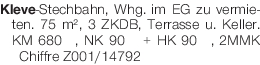 Kleve-Stechbahn, Whg. im EG zu vermieten. 75 m², 3 ZKDB, Terrasse u. Keller. KM 680 €, NK 90 € + HK 90 €, 2MMK Chiffre Chiffre Z001/14792Das könnte Sie auch interessieren