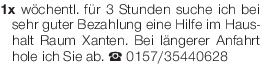 1x wöchentl. für 3 Stunden suche ich bei sehr guter Bezahlung eine Hilfe im Haushalt Raum Xanten. Bei längerer Anfahrt hole ich Sie ab. Tel. 0157/35440628Das könnte Sie auch interessieren