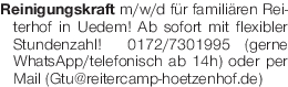 Reinigungskraft m/w/d für familiären Reiterhof in Uedem! Ab sofort mit flexibler Stundenzahl! Tel. 0172/7301995 (gerne WhatsApp/telefonisch ab 14h) oder per Mail (Gtu@reitercamp-hoetzenhof.de)Das könnte Sie auch interessieren