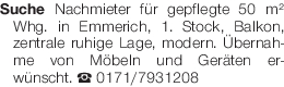 Suche Nachmieter für gepflegte 50 m² Whg. in Emmerich, 1. Stock, Balkon, zentrale ruhige Lage, modern. Übernahme von Möbeln und Geräten erwünscht. Tel. 0171/7931208Das könnte Sie auch interessieren
