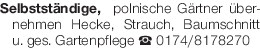 Selbstständige, polnische Gärtner übernehmen Hecke, Strauch, Baumschnitt u. ges. Gartenpflege Tel. 0174/8178270Das könnte Sie auch interessieren