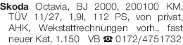 Skoda Octavia, BJ 2000, 200100 KM, TÜV 11/27, 1,9l, 112 PS, von privat, AHK, Wekstattrechnungen vorh., fast neuer Kat, 1.150€ VB Tel. 0172/4751732Das könnte Sie auch interessieren