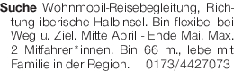 Suche Wohnmobil-Reisebegleitung, Richtung iberische Halbinsel. Bin flexibel bei Weg u. Ziel. Mitte April - Ende Mai. Max. 2 Mitfahrer*innen. Bin 66 m., lebe mit Familie in der Region. Tel. 0173/4427073Das könnte Sie auch interessieren